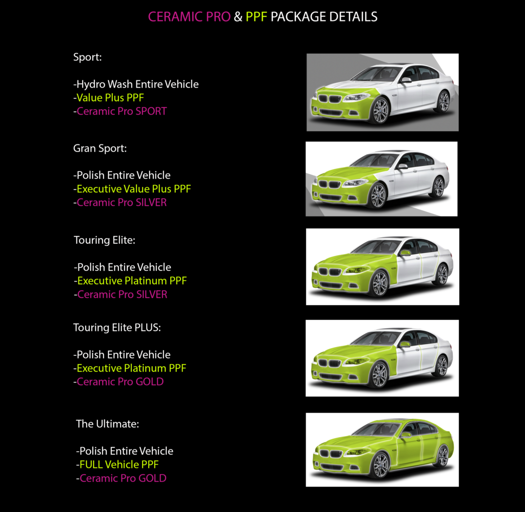 A high quality Ceramic coating is the final step in the process of protecting your vehicle from the harsh elements and accidental abrasions that can affect the paint on your vehicle. Ceramic coatings from Ceramic Pro and Opti Coat offer crystal clear glass shields that are durable and incredibly strong. Ceramic Pro has perfected their 9h formula which can defend and offer paint protection from all the driving hazards that will inevitably hurl themselves at your car! Not only that but adding a Ceramic coating will encapsulate your vehicle in a flexible glass shield that is ultra-Hydrophobic which means nothing will stick to it permanently including road tar and tree sap and bug guts! You’ll simply be able to wash it off! This will also keep your vehicle looking freshly waxed and cleaner longer than normal!